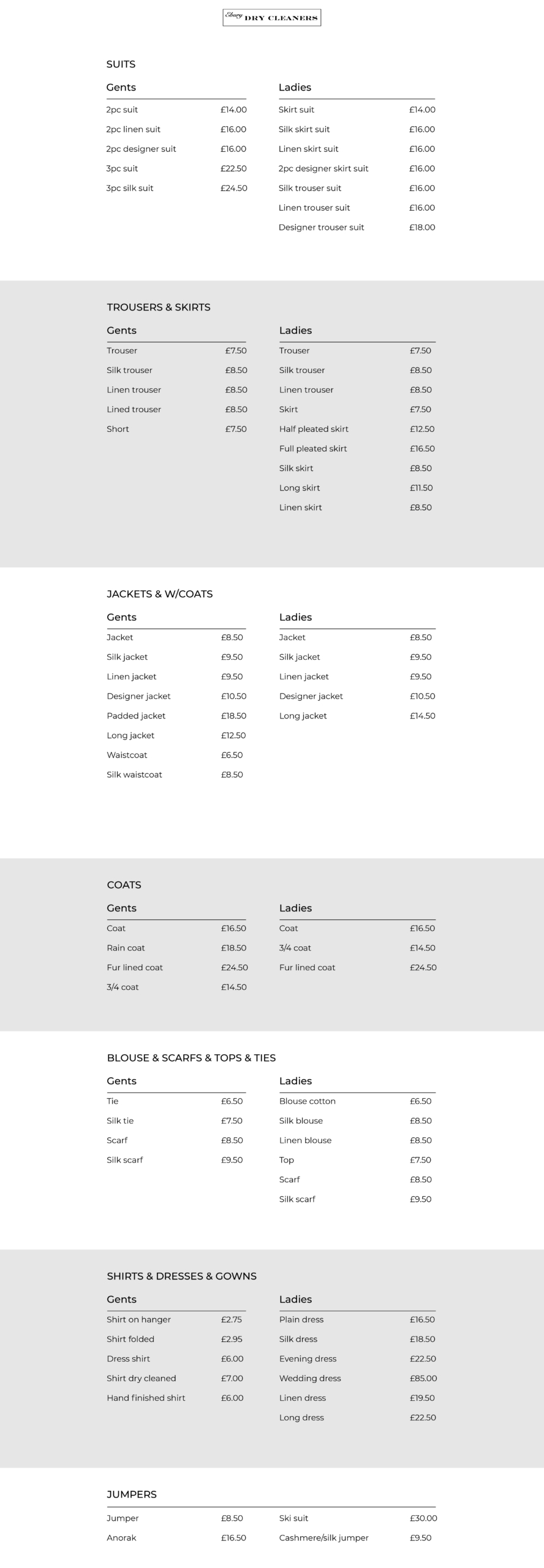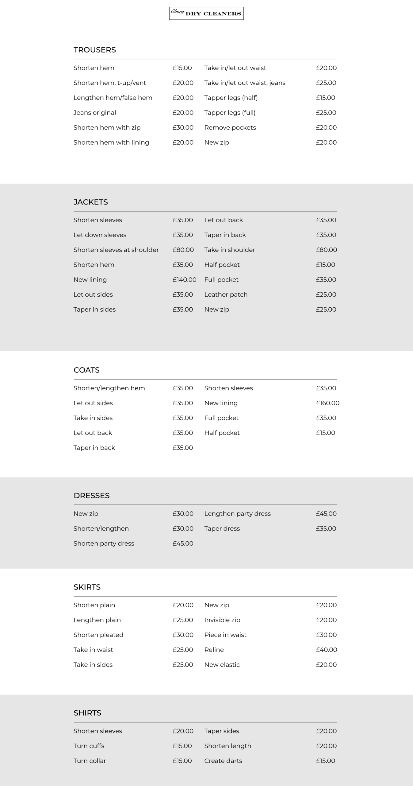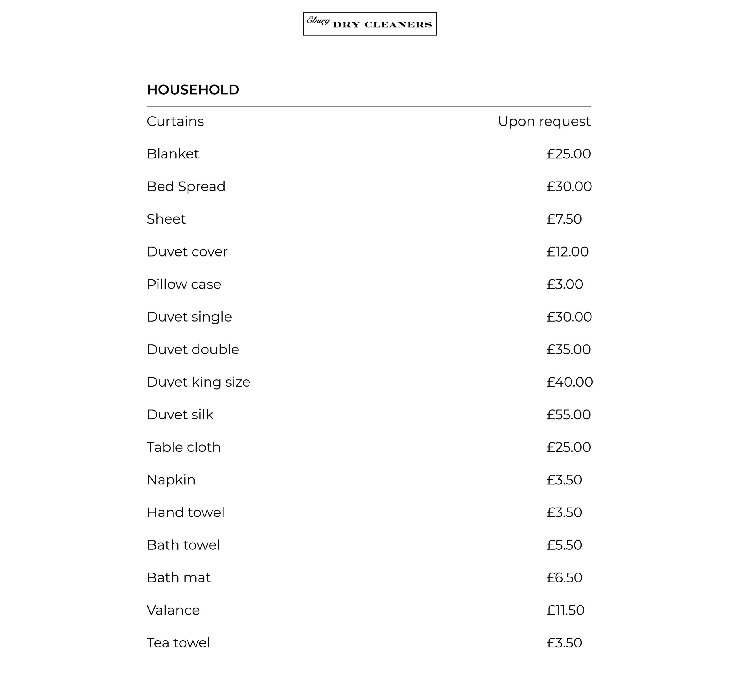 Garments, Household & Alteration Prices Schedule a Pickup Garments View Price List Household View Price List Alteration View Price List Pickup & Delivery ServiceWe offer a complimentary pick-up service from Belgravia within a 3 miles radius.Schedule a Pickup